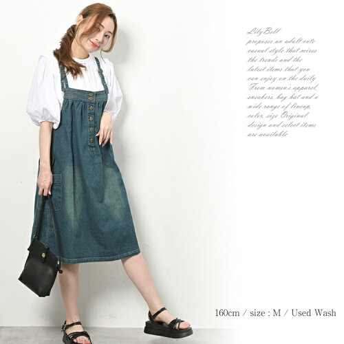 モデル着用カラー(ユーズドウォッシュ) 素材 綿100% 裏地:なし 伸縮:ほどよく伸縮 お手入れ:手洗いOK 【変更点】素材/綿・ポリ⇒綿100% 【変更日時】2018年4月2日 サイズ 【表記サイズ】 【M】W64-70 【L】W69-77 【LL】W77-85 【実寸サイズ】 【M】ウエスト96cm 着丈79cm 肩ひも32〜44cm 【L】ウエスト104cm 着丈82cm 肩ひも32〜44cm 【LL】ウエスト112cm 着丈84cm 肩ひも32〜44cm 備考 シンプルなデザインなので 30代 40代 も着用頂けるカジュアルなガーリースタイルがかわいく決まるデニムジャンバースカート。