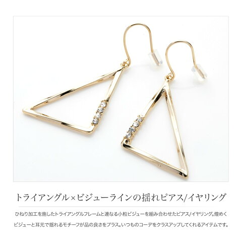 【ゆうパケットOK】トライアングル×ビジューラインの揺れピアス/イヤリング サイズ モチーフの大きさ 2.0cm×1.8cm×0.1cm 重さ 片方 0.8g 素材 本体:合金 キュービックジルコニア(人工石) ポスト:合金(ニッケルフリー)※低アレルギー素材 注意点 ■モニターの都合上、掲載写真と実際の色が異なる場合がございます。